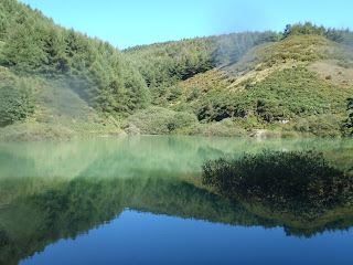 After perusing my OS map the previous night we decided to check out a potential spot just North of our local stretch of the M4. We parked up at the end of the road and set off, rucksacks laden with wetsuits. When we eventually found the start of the footpath, and believe me, this took some time, we walked through a farm yard and got a friendly wave from a farmer driving off in his tractor. We headed up the track which zig zagged up the steep hillside. Tracking through the dappled shade of a wooded valley alongside a tumbling babbling stream we kept disturbing sheep from their sleep. We passed a cave with a spring issuing crystal water from its base and carried on up the steep path. Suddenly the view opened up to our right and we saw the large green mirror of the lake below us.