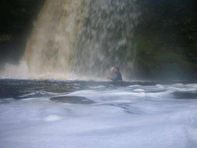 So the four of us jumped in the car and headed off for the 30 minute drive to the falls. Me and Owen filled this time with some traditional taunting of the new blood with tales of ice cold water, dangerous currents, whirlpools and mysterious monsters. When we arrived, the car park of the pub was full and there were a lot of cars parked along the road. There seemed to be an abundance of Regatta clad ‘professional’ amblers milling around the place. We pushed through the crowds as the excitement started to build in anticipation of what was in store for us. Stepping through the gate and looking down the gorge to our right we were instantly disappointed, the river was in flood. We all thought there is no way we are getting a swim today as the ferocity of the white water and whirlpools held our gazes.